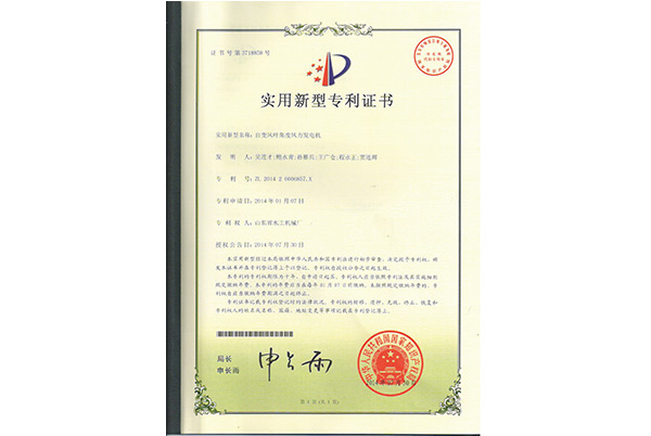 实用新型专利证书—自变风叶角度风力发电机