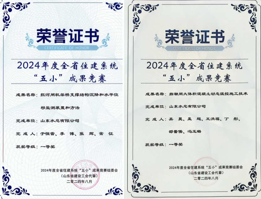 近日,由山东省建设建材工会和山东省建设科技与教育协会组织的2024年度全省住建系统“五小”成果竞赛发布获奖名单,公司申报的《挡潮闸大体积混凝土动态温控施工技术》、《拦河闸机架桥支撑结构沉降和水平位移检测装置和方法》等8项创新成果分别荣获一等奖2项,二等奖2项,三等奖4项。