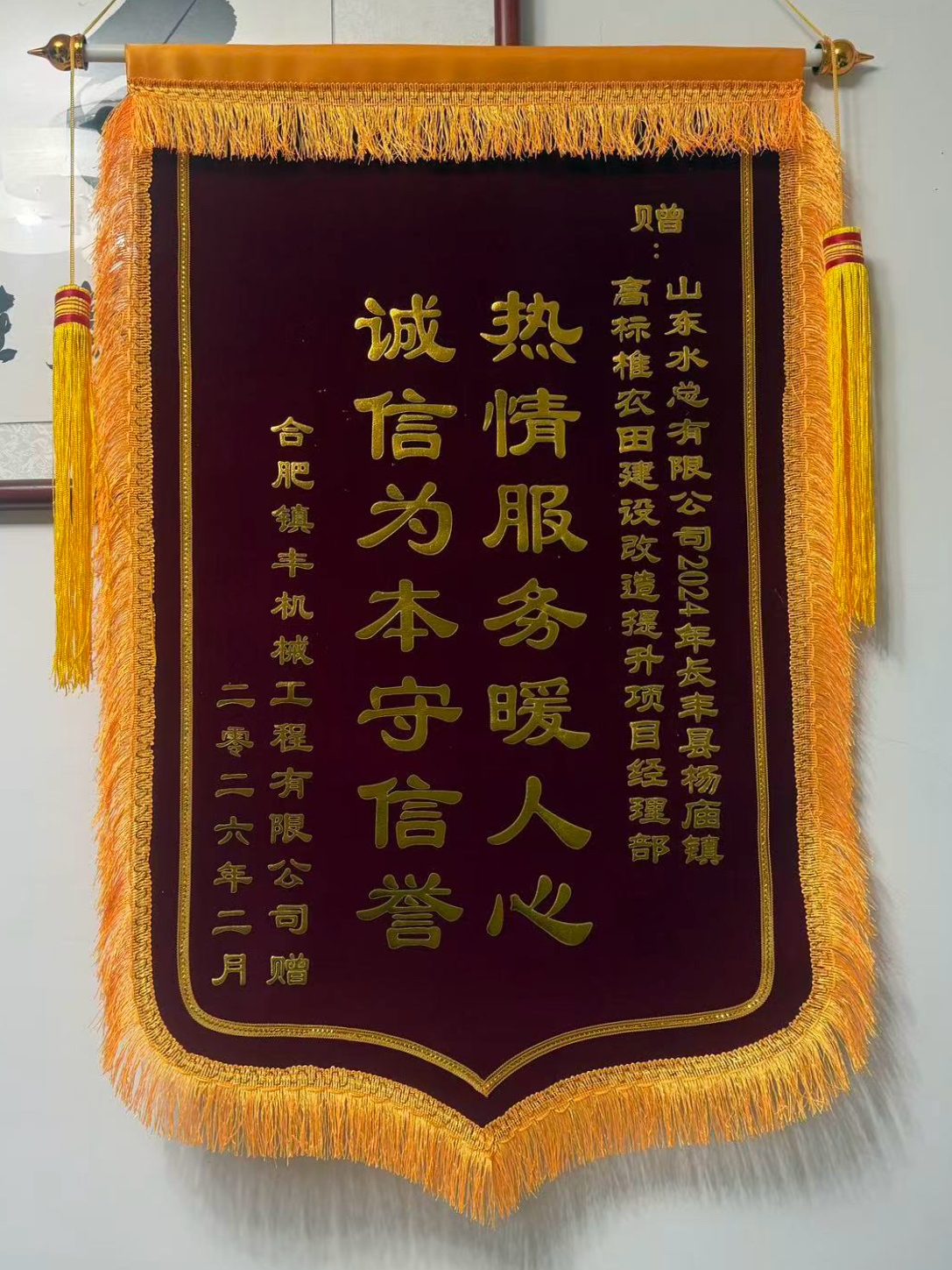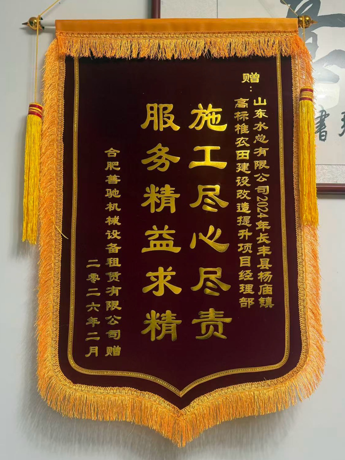 近日,基础有限公司安徽省长丰县杨庙镇高标准农田建设提升改造项目部收到了来自合肥善驰机械设备租赁有限公司和合肥镇丰机械工程有限公司赠送的锦旗。
