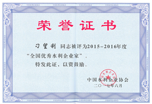 公司刁望利同志荣获2015-2016年度“全国优秀水利企业家”